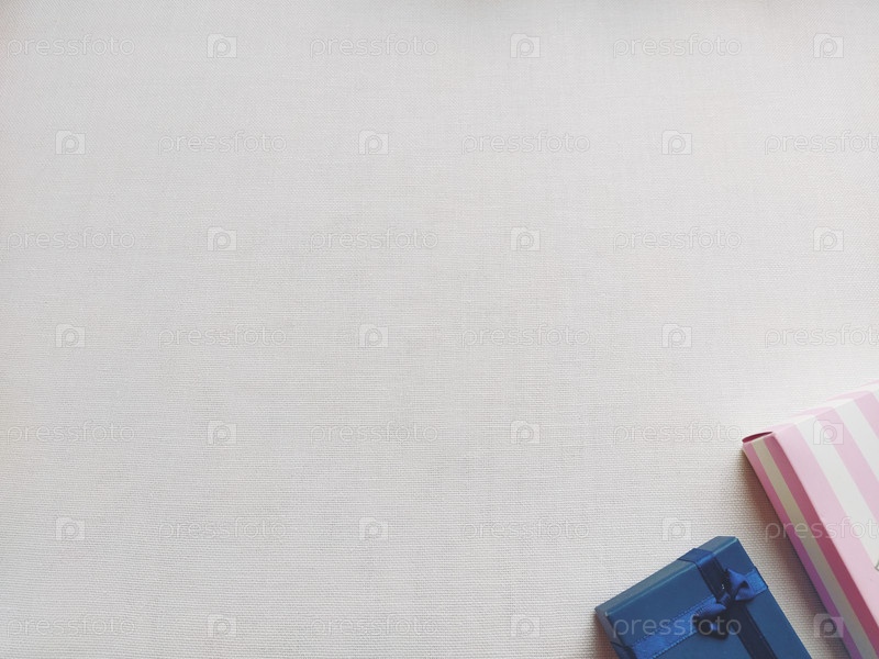 Розовые и голубые подарочные коробки с бантом на фоне светлой ткани. Скопируйте пространство. Подарки к празднику. Оформление подарка