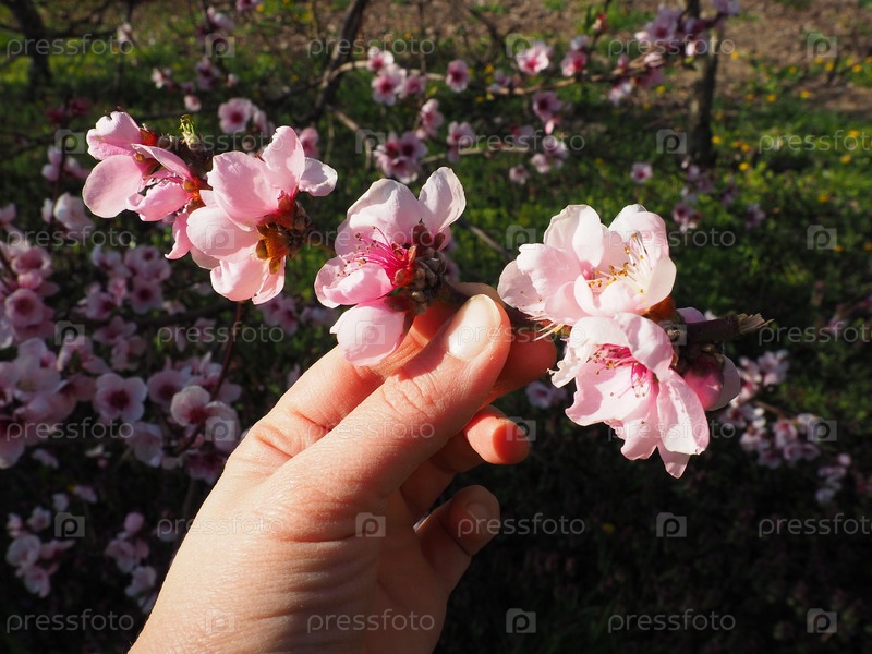 Женская рука держит ветку с розовыми цветами. Розовые цветы на дереве. Красивое дикое цветение в весеннем саду. Ветки вишни или сливы с бутонами. Сельское хозяйство и садоводство