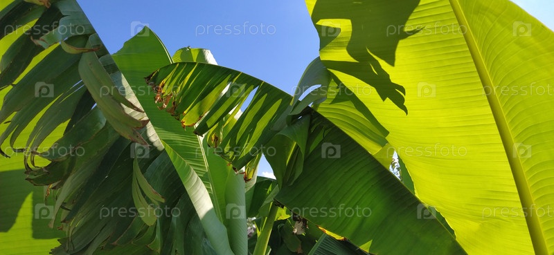 Зеленый банановый лист в природе, банановый лист. Тропические пальмы на фоне голубого неба. Поврежденные листья ярко-зеленого цвета