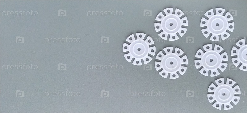 Белые детали в виде снежинок от детского конструктора на сером фоне в левой части изображения. Пластмассовые диски для развития мелкой моторики