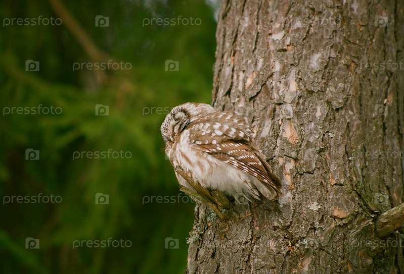 Маленький совенок сладко спит, устроившись, на небольшом сучке сосны