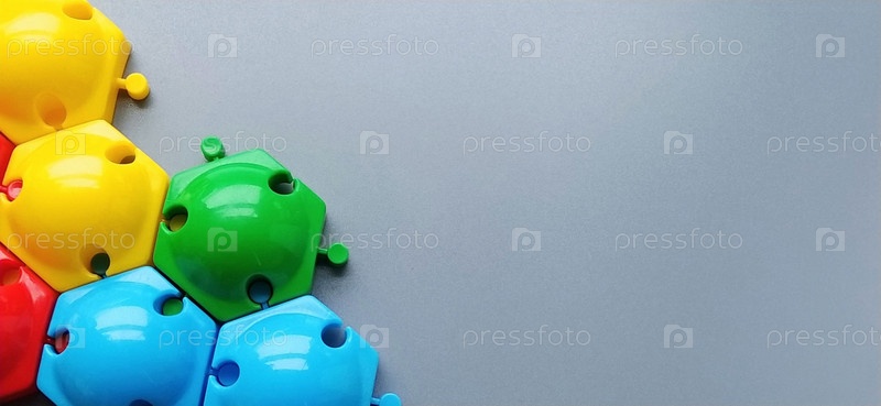 Разноцветные детали от детского конструктора на сером фоне. Красные, желтые, зеленые, синие пластиковые диски для развития мелкой моторики пальцев