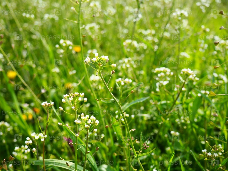 Растение пастушьей сумки на лугу. Capsella bursa-pastoris. Луга или поле. Лесная лужайка в лесу. Цветящие полевые травы. Цветущая дикая луга или пастбище. Свежая зеленая трава весной. Белые цветы