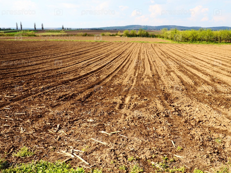 Пейзаж с распаханными сельскохозяйственными угодьями, подготовленными к уборке урожая. Сельскохозяйственный ландшафт, пахотные земли для однолетних культур, которые можно вспахать и использовать для выращивания сельскохозяйственных культур. Сербия, Сремск