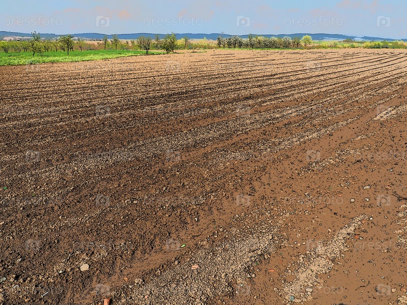 Пейзаж с распаханными сельскохозяйственными угодьями, подготовленными к уборке урожая. Сельскохозяйственный ландшафт, пахотные земли для однолетних культур, которые можно вспахать и использовать для выращивания сельскохозяйственных культур. Сербия, Сремск