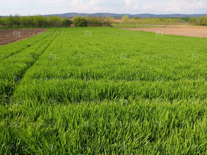 Красивое зеленое пшеничное поле в сельской местности. Зеленое пшеничное поле. Зеленые ростки пшеницы в поле. Зеленая трава