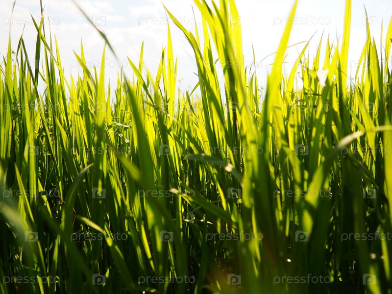 Красивая сочная зеленая трава на лугу или в поле. Озимая пшеница выросла на сельхозугодьях. Солнечная погода. Поле, поляна или луг с дикой растительностью. Естественный фон