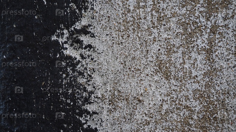Бетонная стена с черно-белой полосой краски. Небрежно зачищенные детали, сквозь нанесенную масляную краску просвечивается серая штукатурка. Гранж-фон с пустым пространством. Копировать пространство