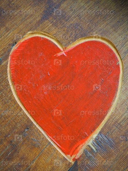 Форма сердца вырезана ножом на деревянной поверхности и окрашена в ярко-красный цвет. Символ любви и верности. Открытка или картинка для поздравления или признания в День святого Валентина