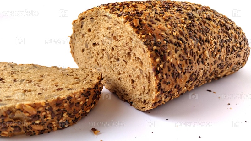 Свежий ржаной хлеб нарезать кусочками. Белый фон. Хлеб с отрубями и семечками