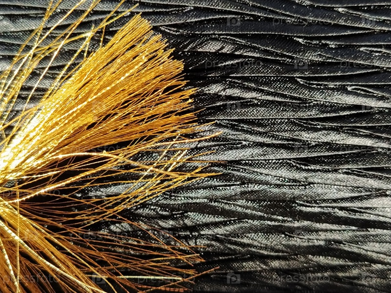 Золотая кисточка на шелковой черной фактурной ткани. Блестящая ткань и шелковые нити. крупный план