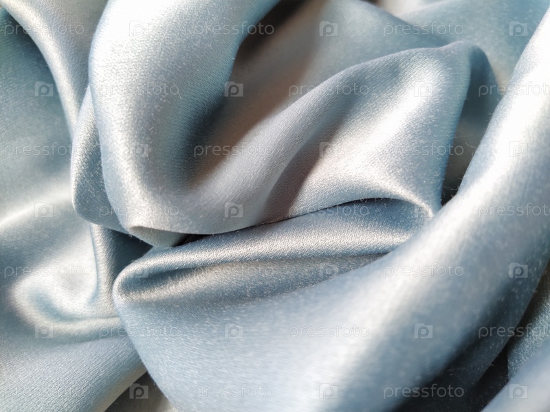 Шелковистая на ощупь ткань серо-голубого цвета с блестящим отливом. Естественное освещение, свет и тень. Материал небрежно сложен. Полиэстер Текстиль