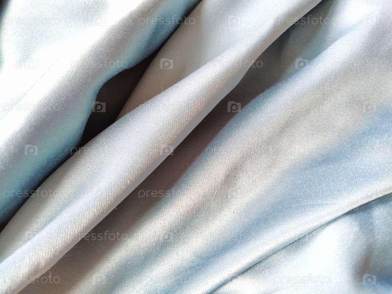 Шелковистая на ощупь ткань серо-голубого цвета с блестящим отливом. Естественное освещение, свет и тень. Материал небрежно сложен. Полиэстер Текстиль