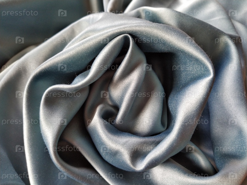 Шелковистая на ощупь ткань серо-голубого цвета с блестящим отливом. Естественное освещение, свет и тень. Материал небрежно сложен в круг, напоминающий бутон розы. Текстиль из полиэстера