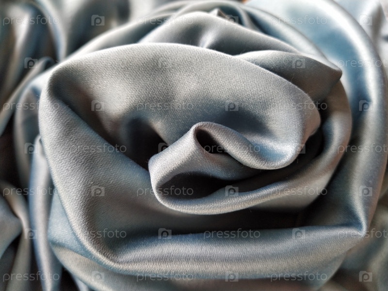 Шелковистая на ощупь ткань серо-голубого цвета с блестящим отливом. Естественное освещение, свет и тень. Материал небрежно сложен в круг, напоминающий бутон розы. Текстиль из полиэстера