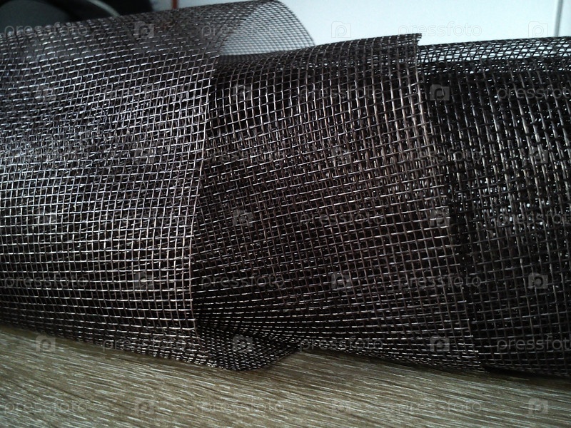 Москитная сетка в рулоне. Коричневый синтетический материал на белом фоне. Плетение из пластиковых нитей. Свернутая решетка