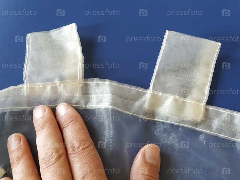 Рука швеи на прозрачной органзе. Петли на тюлевой занавеске. Пошив штор. Синий фон