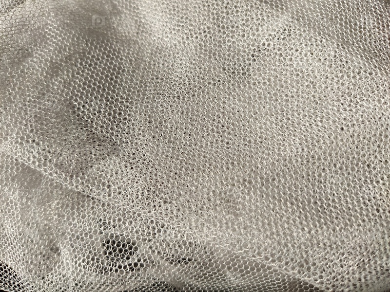 Прозрачный белый сетчатый тюль. Сетчатая ткань смята или небрежно сложена. Крупный план
