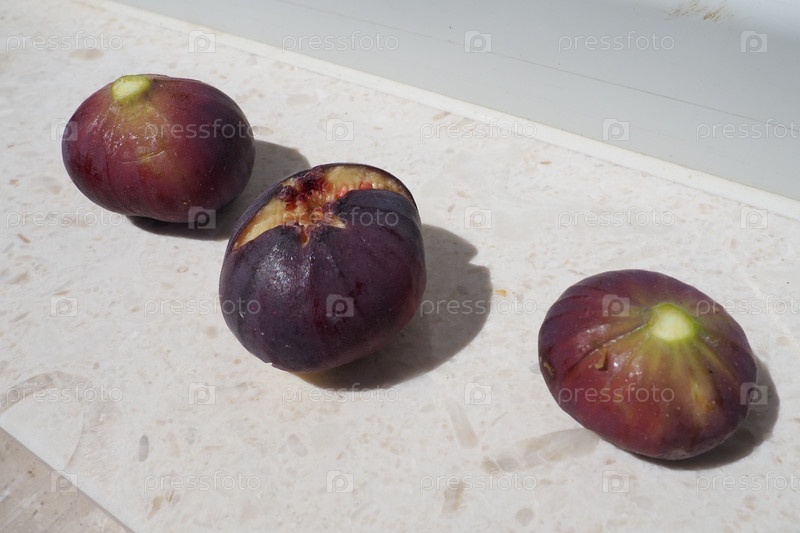 Фикус или фиквы, или обыкновенная инжирка, или Ficus carica субтропическое листопадное растение рода Фикуса семейства Тутовых. Зрелые фиолетовые плоды смоковницы на светлом фоне. Здоровая пища