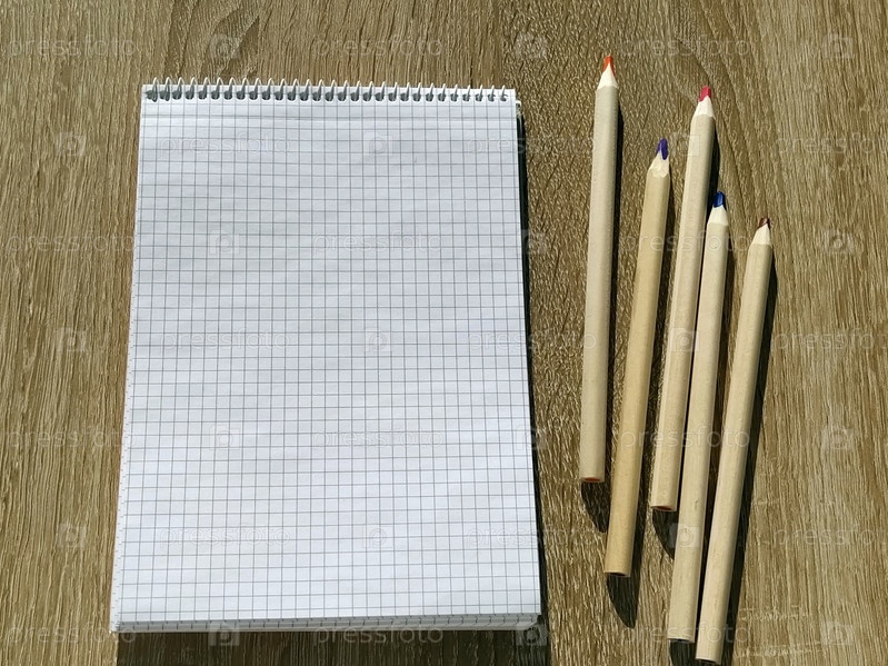 Вид сверху пустой открытой тетради и карандашей на деревянном фоне. Канцелярские принадлежности. Школьные принадлежности для школьника. Концепция образования. Пустой квадратный лист бумаги. пять цветных карандашей