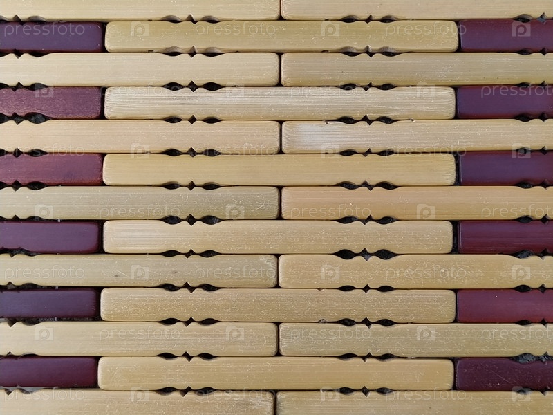 Тростник или деревянная циновка. Коврик представляет собой коврик под жаркое. Вязаные палочки из обработанного дерева с закругленными краями. Крупный план. Желтый, коричневый и бежевый цвета. Боковое освещение. Традиционная текстура бамбуковой подушки