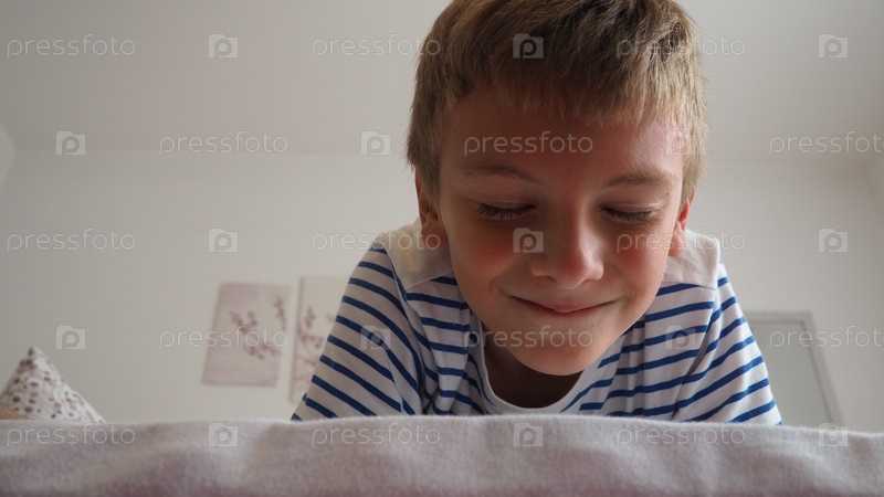 Симпатичный маленький кавказский мальчик 10 лет лежит дома на кровати в спальне и лукаво улыбается, щурясь и закрывая глаза. Ожидание сюрприза, шутки и баловства. Пикабу. Играть в Блиндерс