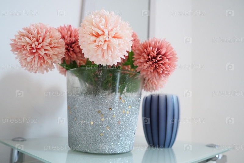 Букет красивых розовых искусственных цветов на белом столе в спальне. Дизайн интерьера. Дизайн интерьера женской спальни. Букет в вазе. Ароматическая полосатая свеча. Зеркало на стене