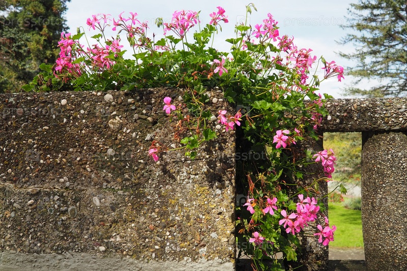 Цветущая розовая плющелистная герань пеларгония, вертикальный дизайн озеленения улиц и парков. Красивые крупные цветы герани пеларгонии герани. Цветоводство и садоводство. Баня Ковиляча