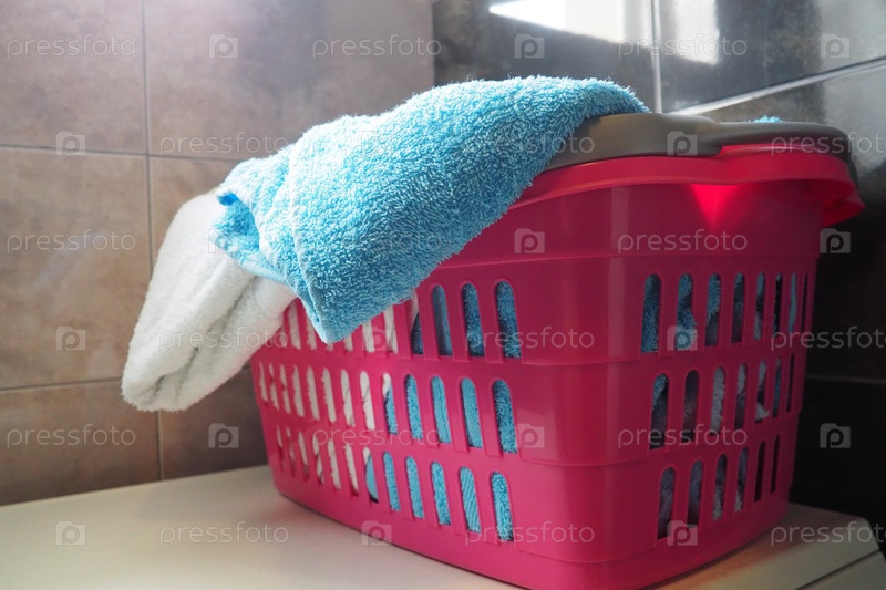 Полотенца в корзине для белья. Синие и розовые хлопковые махровые полотенца брошены в розовую пластиковую корзину. Уборка. Хранение и разделение белья перед стиркой. Свет сверху из открытого окна