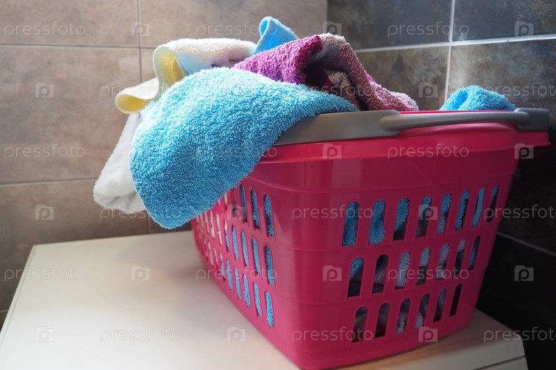 Полотенца в корзине для белья. Синие и розовые хлопковые махровые полотенца брошены в розовую пластиковую корзину. Уборка. Хранение и разделение белья перед стиркой. Свет сверху из открытого окна