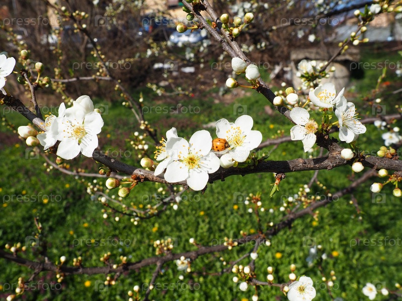 Цветущие фруктовые деревья в саду. Вишни, черешни, сливы, яблони в цвету. Белые цветы на ветвях