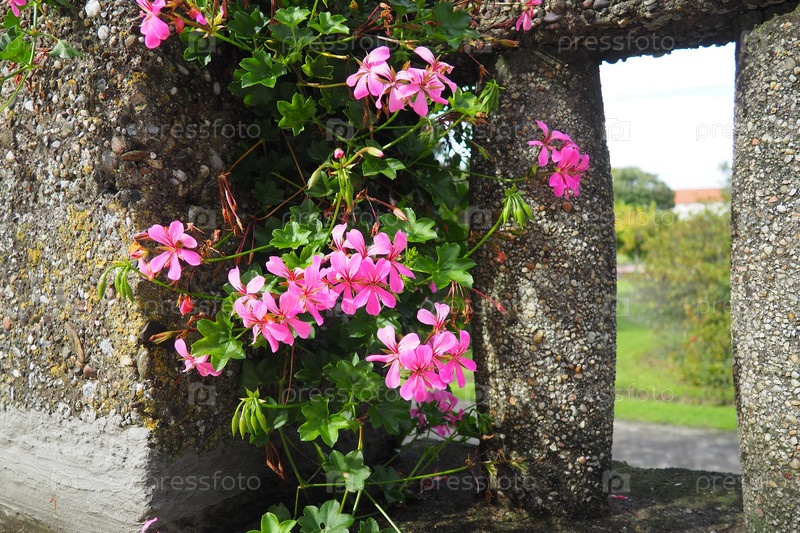 Цветущая розовая плющелистная герань пеларгония, вертикальный дизайн озеленения улиц и парков. Красивые крупные цветы герани пеларгонии герани. Цветоводство и садоводство. Баня Ковиляча
