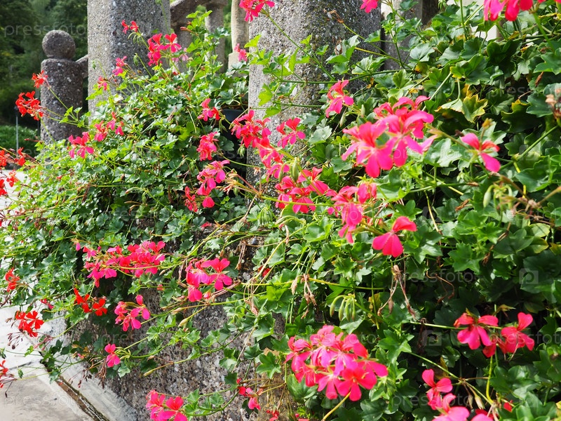 Цветущая розовая плющелистная герань пеларгония, вертикальный дизайн озеленения улиц и парков. Красивые крупные цветы герани пеларгонии герани. Цветоводство и садоводство. Баня Ковиляча