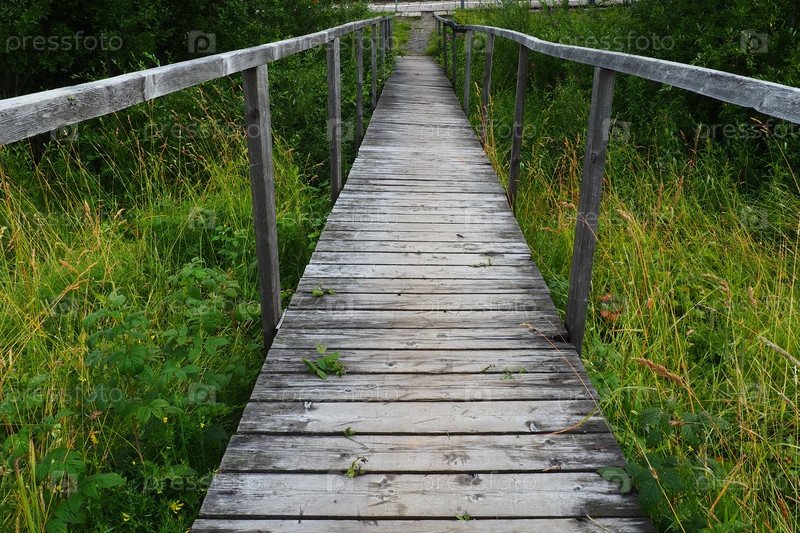 Старый деревянный подвесной мост через болотистую канаву с высокой зеленой травой. Дорога в никуда. Заброшенное место. Походы на природу. Два длинных поручня для безопасности. Станция Нырки, Карелия. Пасмурный вечер