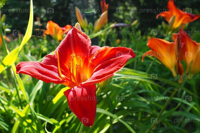 Hemerocallis hybrid Anzac род растений семейства липовидных Asphodelaceae. Красивые красные лилии с шестью листочками. Длинные тонкие зеленые листья. Цветение и садоводство как хобби