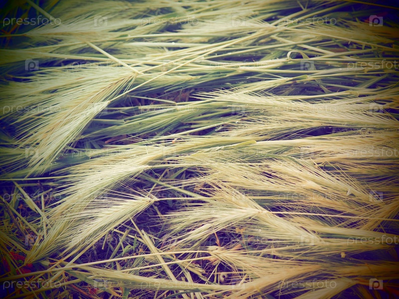 Колосья спелой пшеницы или злакового растения. Семена на стебле и колосе. Естественный спокойный фон. Потеря урожая пшеницы, многие колосья спелых зерен лежат на земле после ветра и дождя. Тема деревенского образа жизни