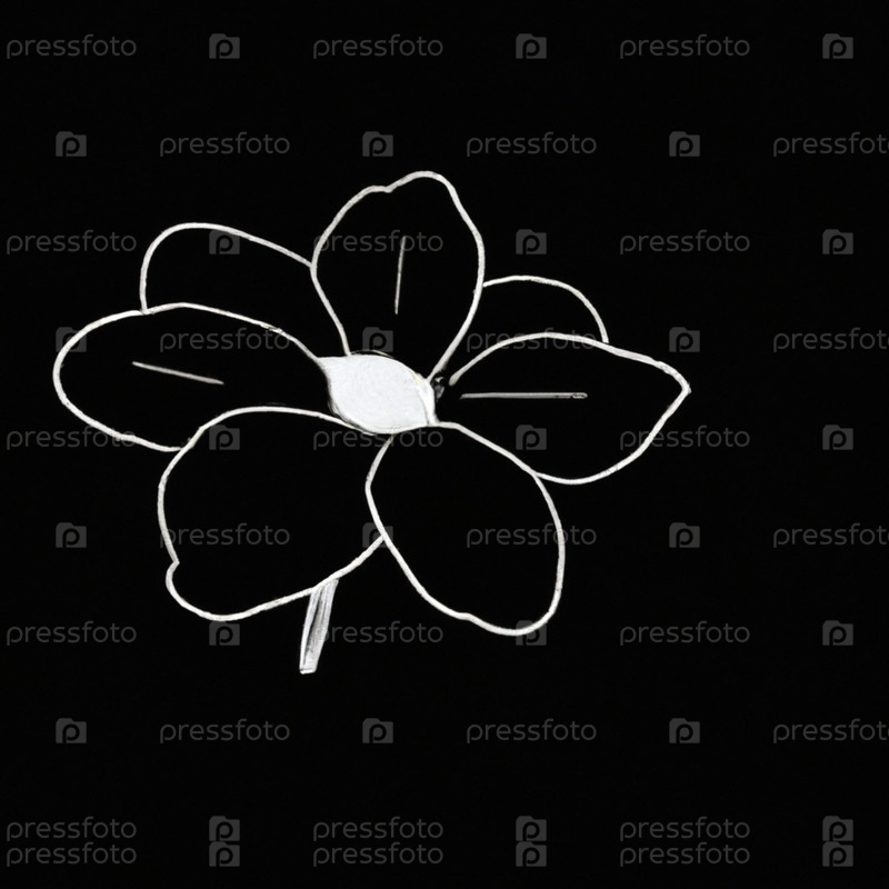 Нарисованный от руки белым карандашом простой цветок с семью лепестками на черном фоне. Копировать пространство