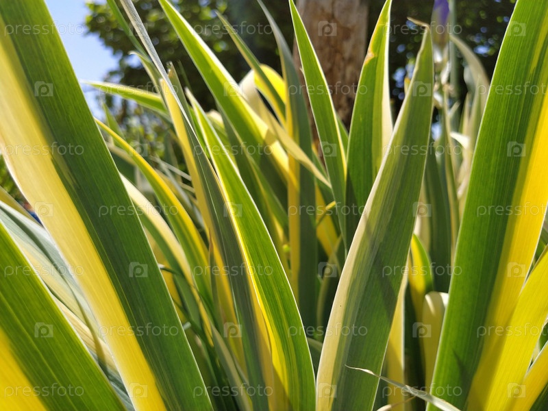 Крупный план желто-зеленых полосатых листьев. Ирисы в саду. Род многолетних корневищных растений семейства Ирисовые. Желто-зеленые длинные полосатые листья. Цветочный фон. Садоводство и цветоводство