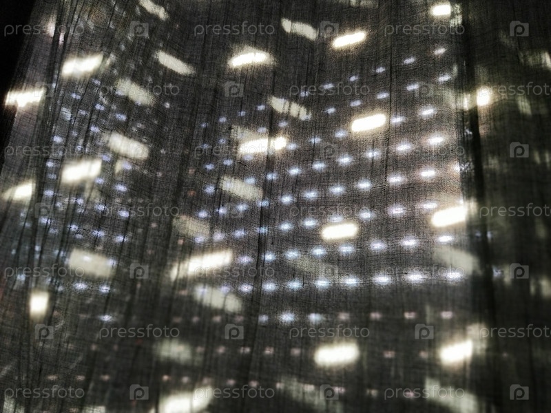 Солнечный свет пробивается сквозь жалюзи с дырочками и серые портьеры - тюль. Абстрактное изображение. Летнее настроение. Отражение световых пятен на ткани