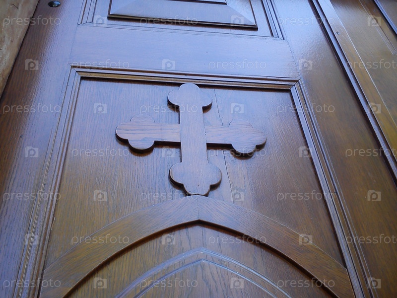 Деревянная старая церковная дверь. Резной деревянный крест и лакированная поверхность, гладкая, блестящая при естественном освещении