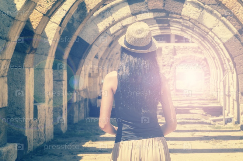 Молодая женщина-путешественница сзади. Знаменитая Агора в Измире, Турция. Концепция путешествия