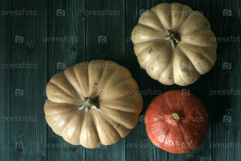 Деревянный стол украшен овощами, тыквами, кукурузой и осенними листьями. Осенний фон. Концепция Дня благодарения или Хэллоуина