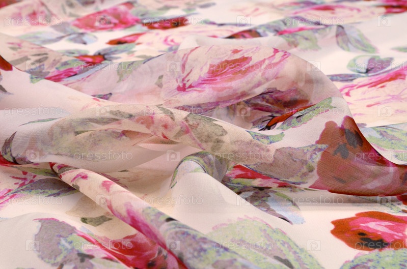 Шелковая ткань шифон с цветочным орнаментом на слоновой кости