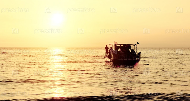 Силуэты на пляже в лучах заходящего солнца на острове Самет, Таиланд