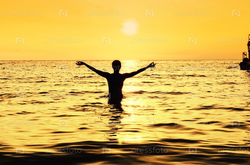 Силуэты на пляже в лучах заходящего солнца на острове Самет, Таиланд