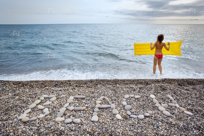 Молодая женщина держит в руках надувной матрац на берегу моря, надпись "Пляж"