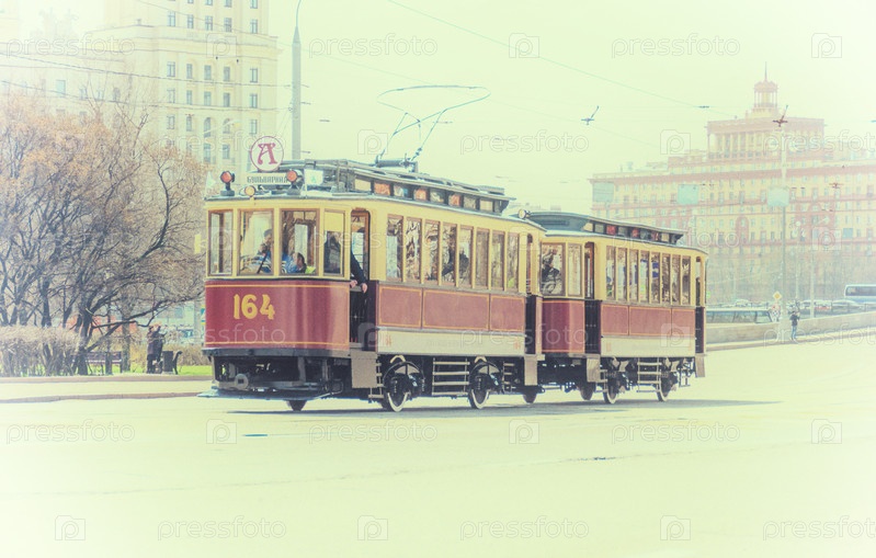 Традиционный парад трамваев в городе Москва в винтажном стиле для журналов