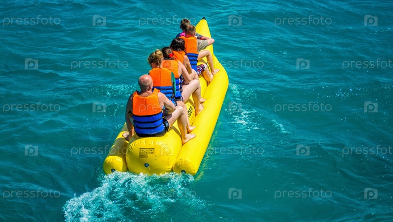 Эль-Гуна/Египет - 11 апреля 2015 г.: Морской аттракцион, счастливые люди катаются на надувной лодке