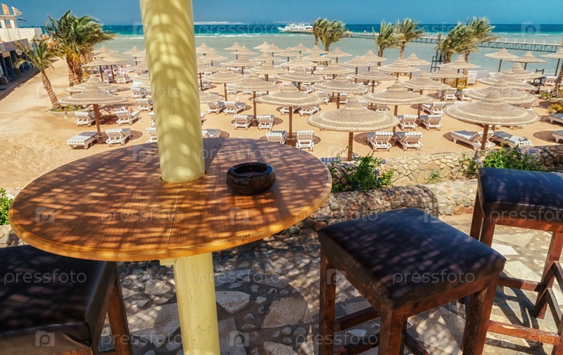 Шезлонг и зонтики на пляже на фоне голубого неба и моря. Египет, Хургада