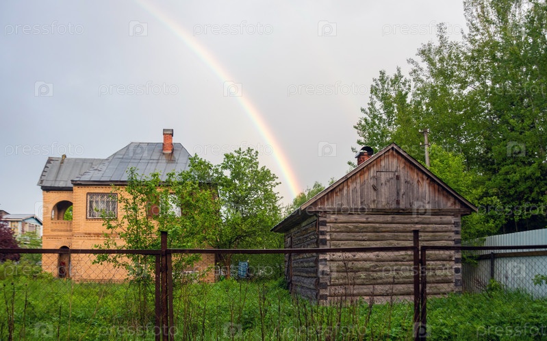 Небольшой загородный дом летним вечером. Радуга над домом. Красивый закат. Цветы в саду. Россия